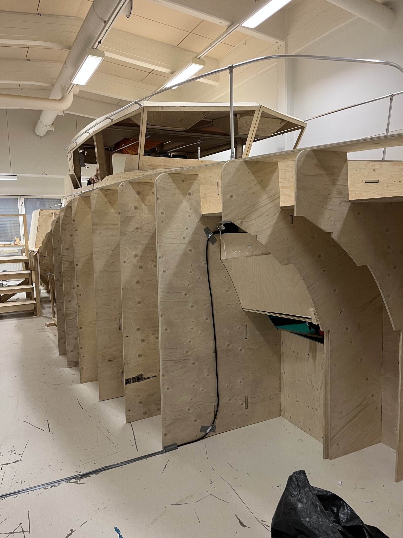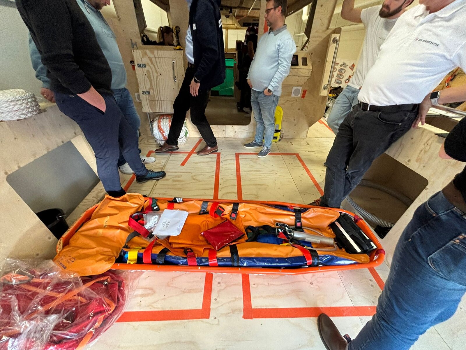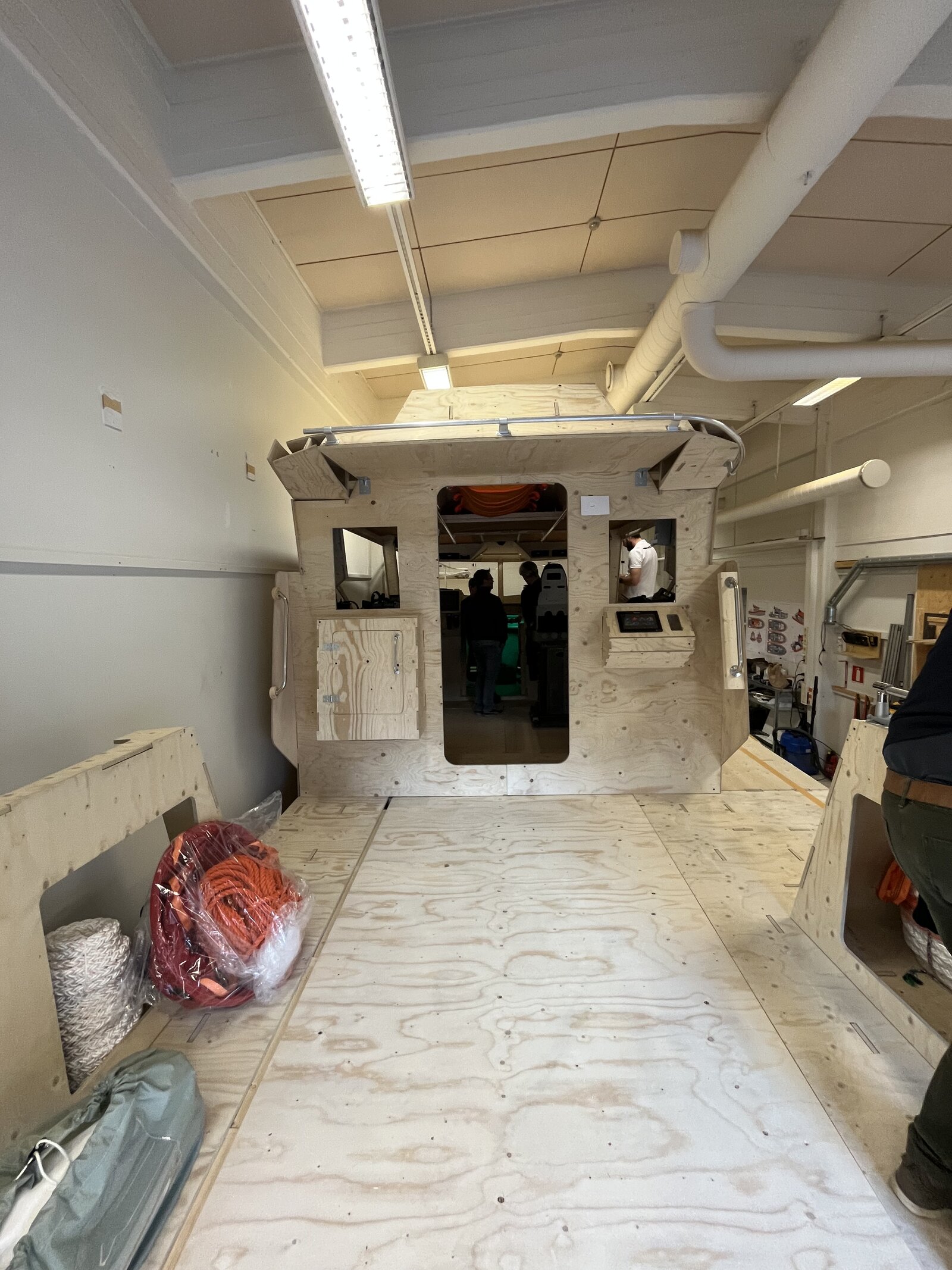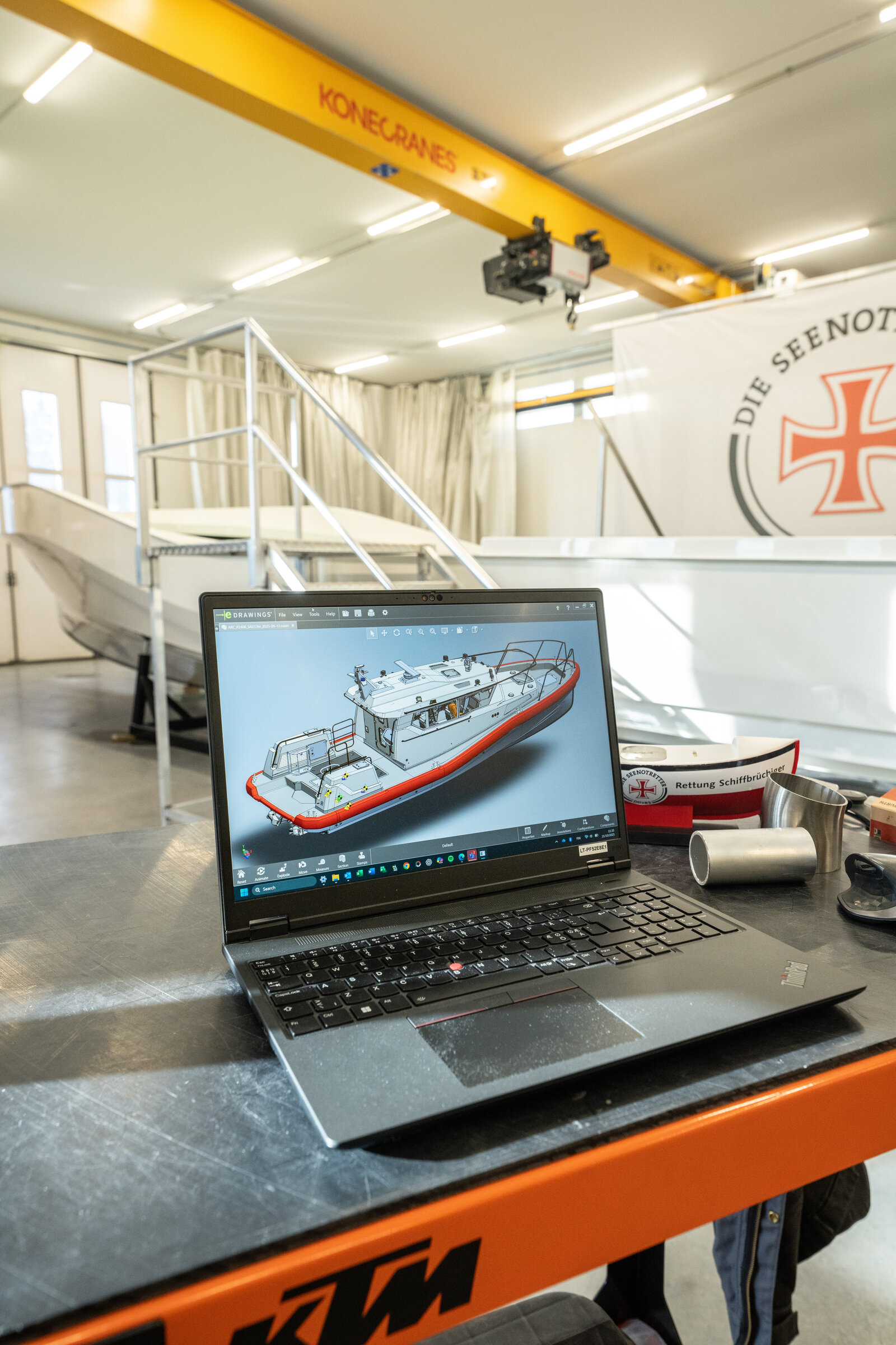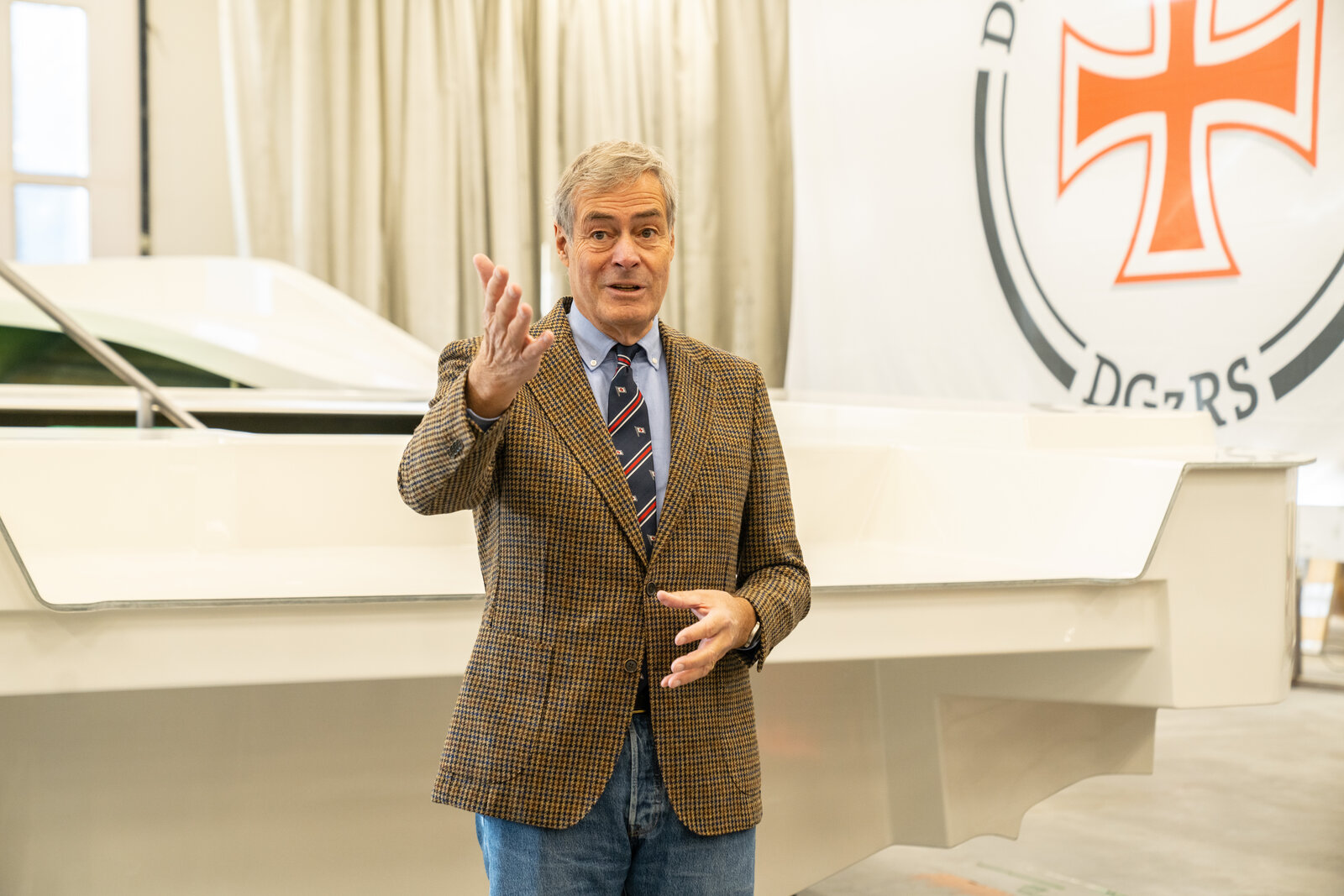 Vor dem Bau des Prototyps testen die Seenotretter gemeinsam mit Schiffbauspezialisten seine Seegangseigenschaften am Computer und in einem Versuchstank. Außerdem bekommen sie anhand eines 1:1-Holzmodells (Mockup) ein Gefühl für die Dimensionen des neuen Seenotrettungsbootes.
