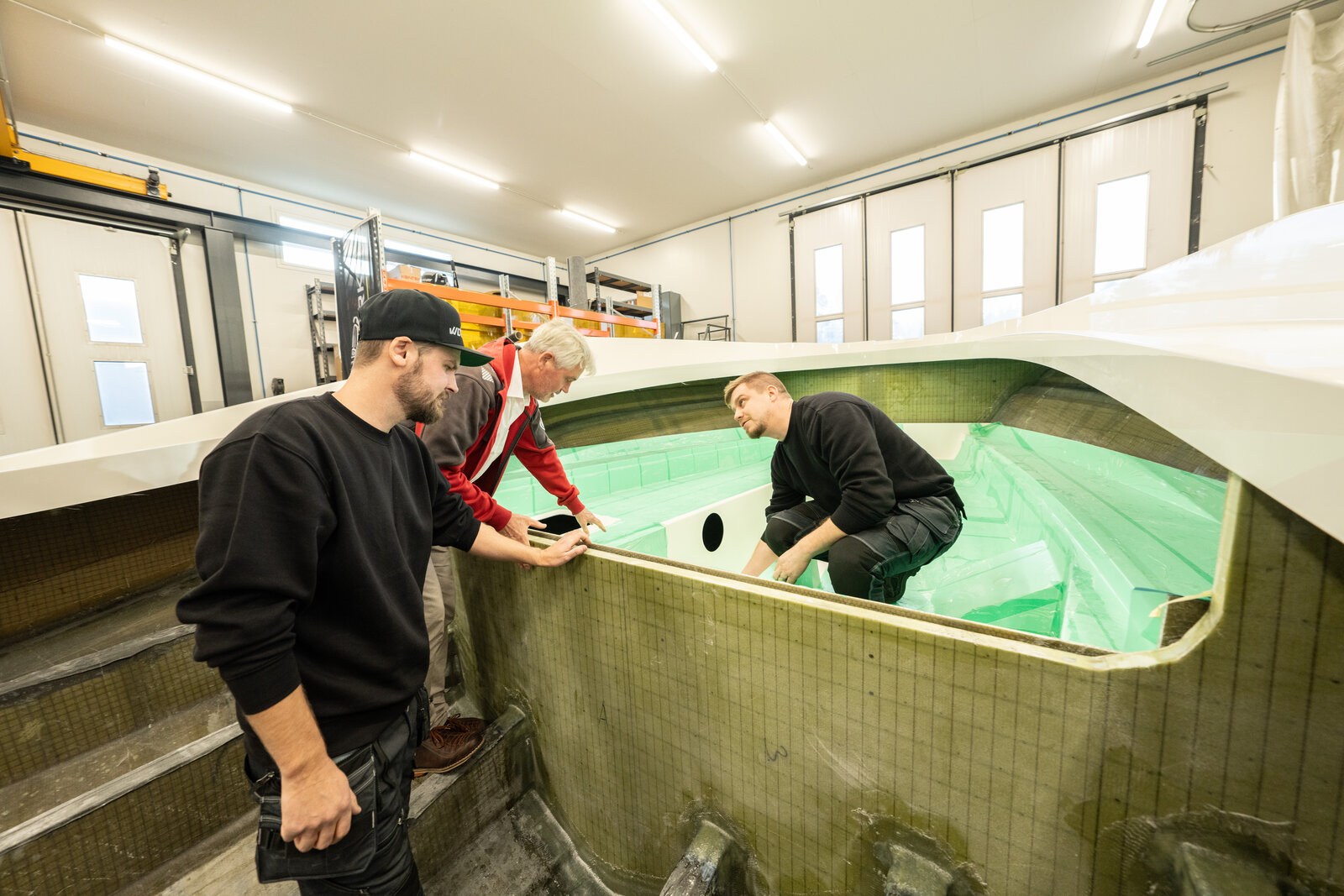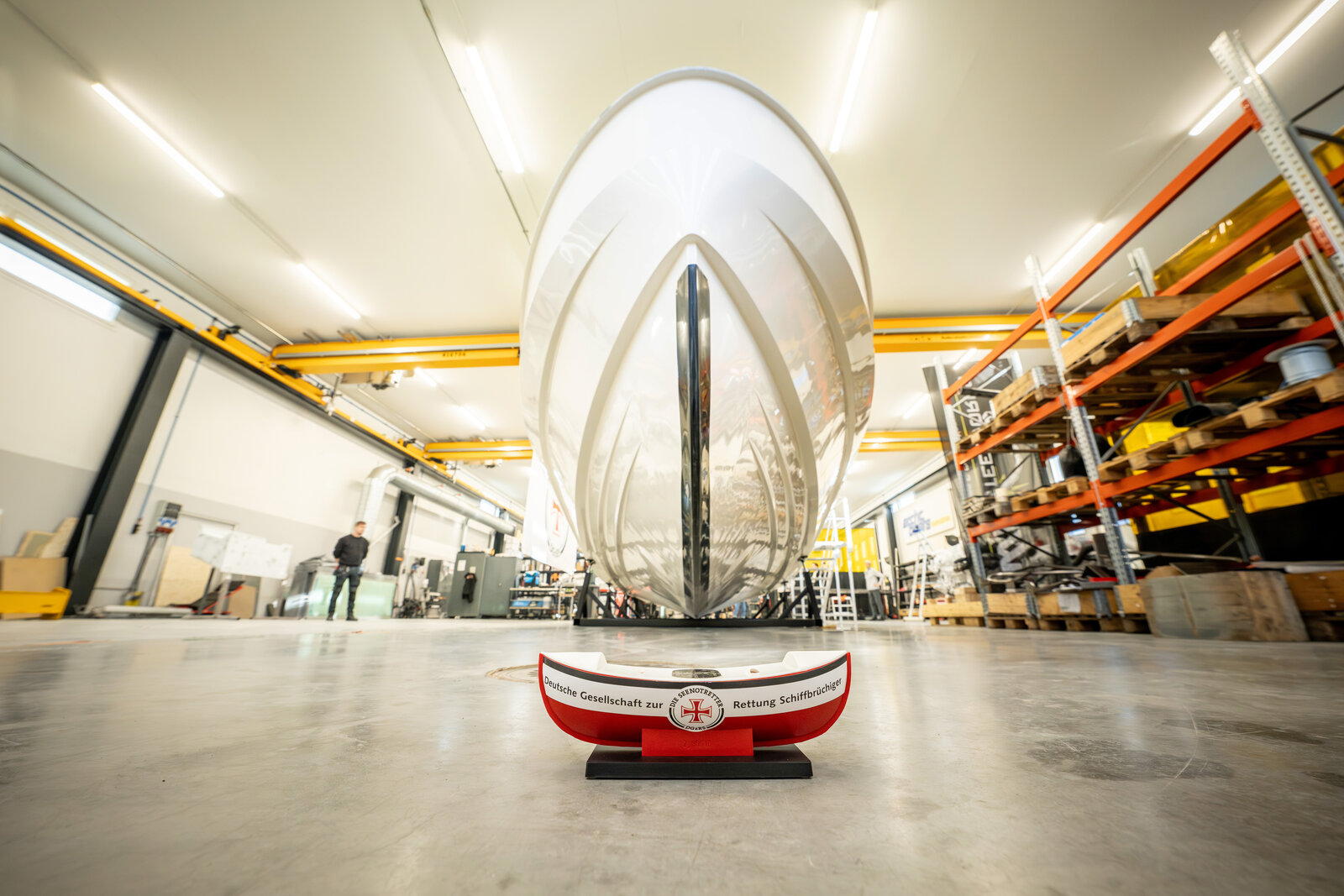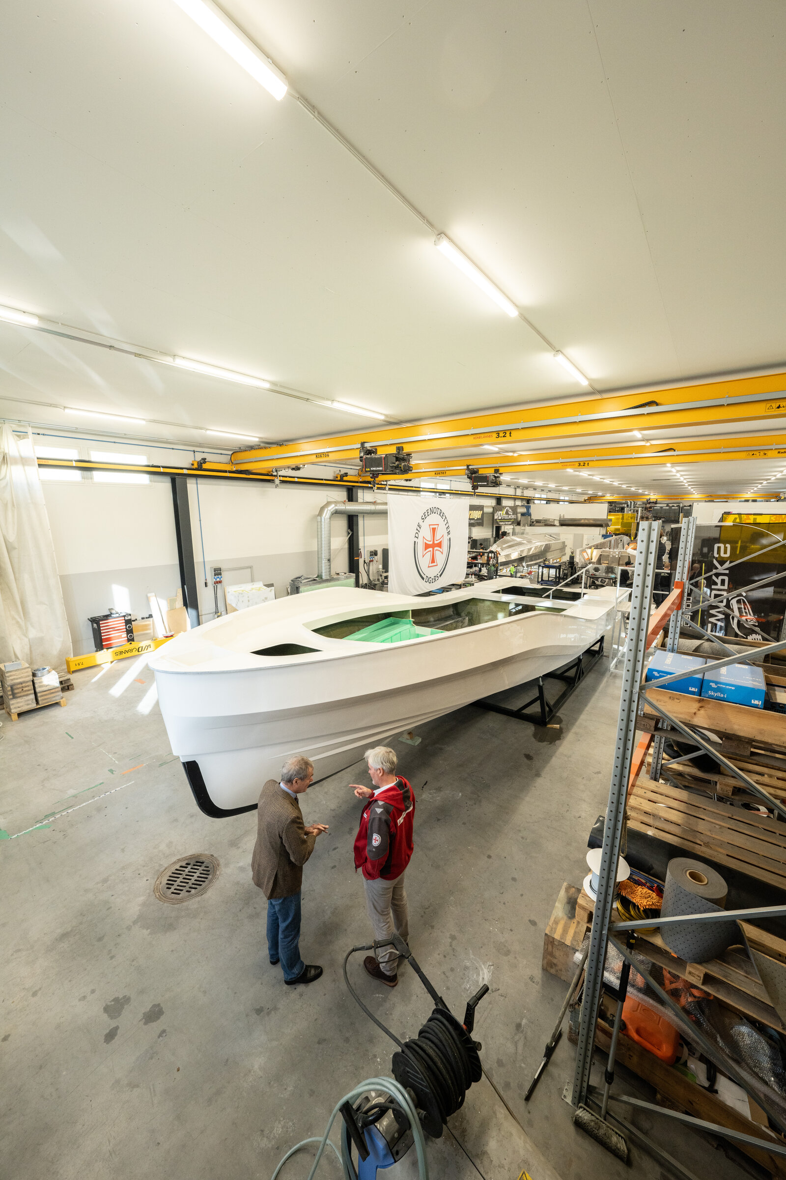 Nach erfolgreichen Tests am Computer und im Versuchstank bauen die Seenotretter gemeinsam mit Schiffbauspezialisten gegenwärtig den Prototyp einer neuen Klasse von Seenotrettungsbooten. Der erste Neubau trägt die DGzRS-interne Bezeichnung SRB 90. In den ersten Arbeitsschritten fertigen die Schiffbauer Grundformen (Mould) an, in denen nach und nach die einzelnen Bestandteile wie Rumpf und Deck entstehen.