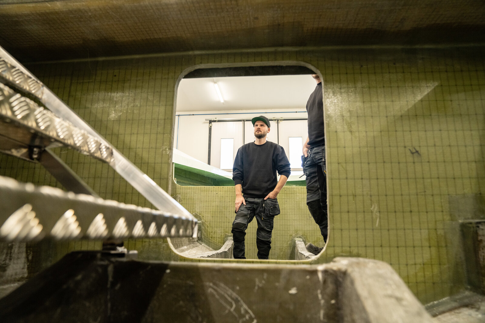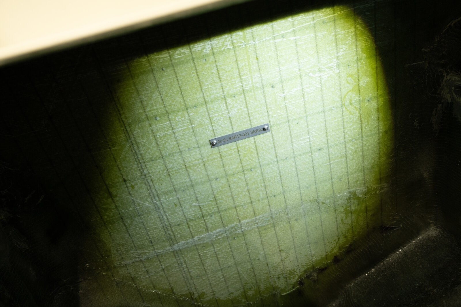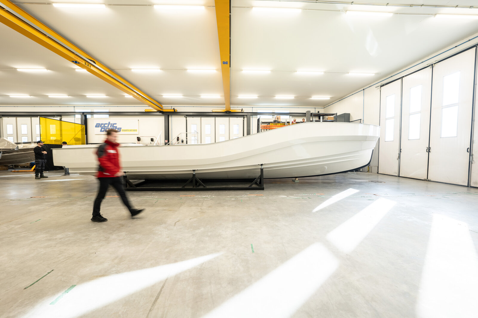 Auf die Grundform (Mould) legen die Schiffbauer zielgenau Matten aus glasfaserverstärktem Kunststoff (GFK). Je nachdem wie fest, steif und robust die einzelnen Bereiche des Rumpfes sein sollen, sind die Lagen unterschiedlich dick und die Matten verschieden aufgebaut. An den Fensterrahmen und Fundamenten der Hauptmaschinen kommen noch zusätzlich Matten aus kohlenstofffaserverstärktem Kunststoff (CFK) – kurz: Carbon – zum Einsatz. Dies erhöht die Festigkeit nochmals. Anschließend kommt erneut das Vakuum-Infusionsverfahren zum Einsatz. Einziger Unterschied: statt mit grünem wird die Mould zuvor mit weißem Gelcoat beschichtet.